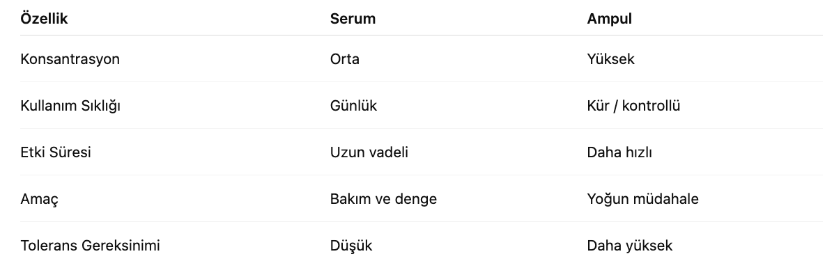 Eğer cilt problemi ilerlemiş, kronikleşmiş veya daha hızlı müdahale gerektiriyorsa; serum destekleyici rol üstlenir ancak tek başına yeterli olmayabilir. Bu durumda daha konsantre ve kür mantığında kullanılan ampul formülleri devreye girer.